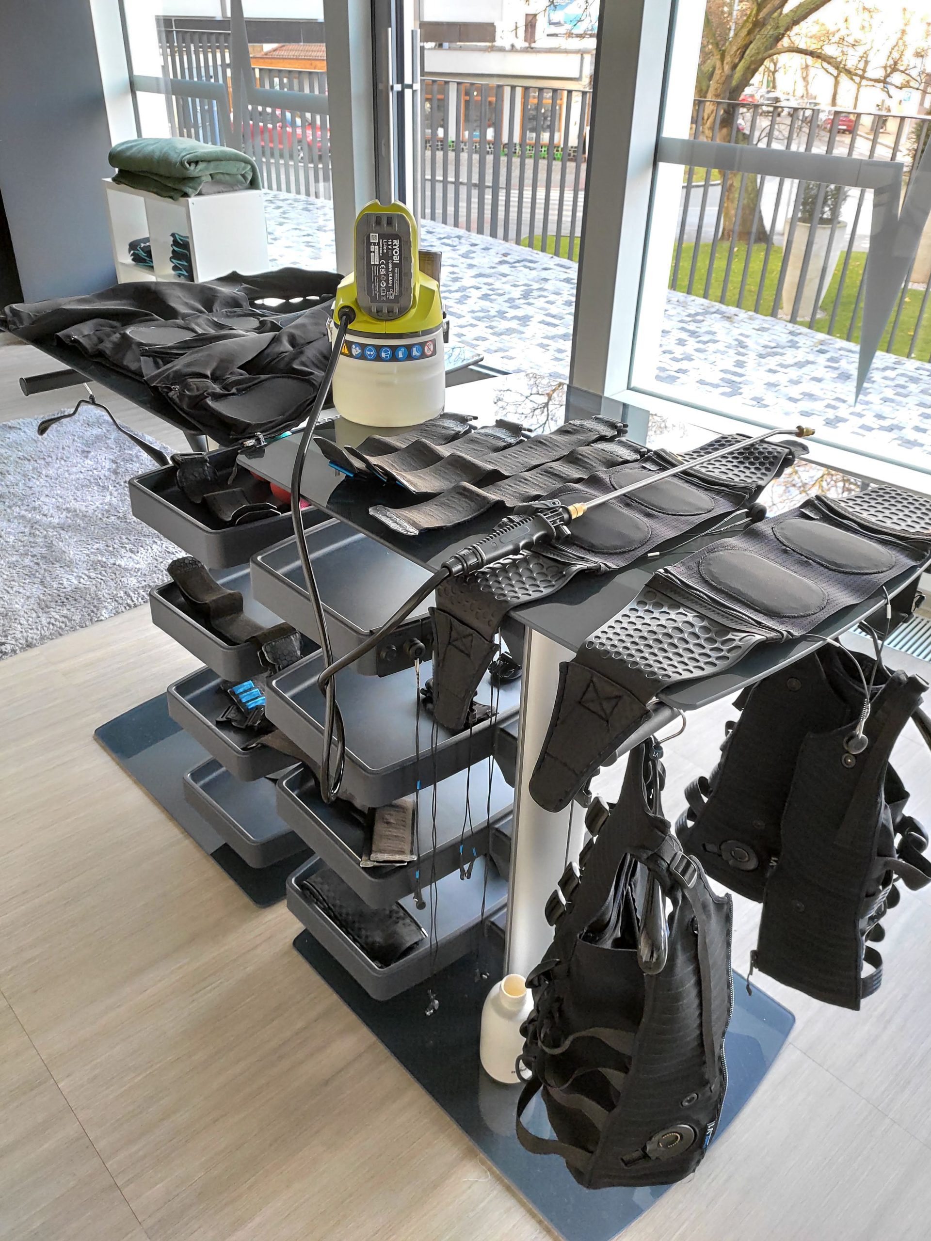 Během toho, co se převlékám, trenérka namáčí vestu, pás přes hýždě a pásky na ruce a nohy opatřené elektrodami. Nasazení všech elektrod trvá zhruba 2 minuty. Vesta se pak připojí k EMS přístroji a jde se na věc.